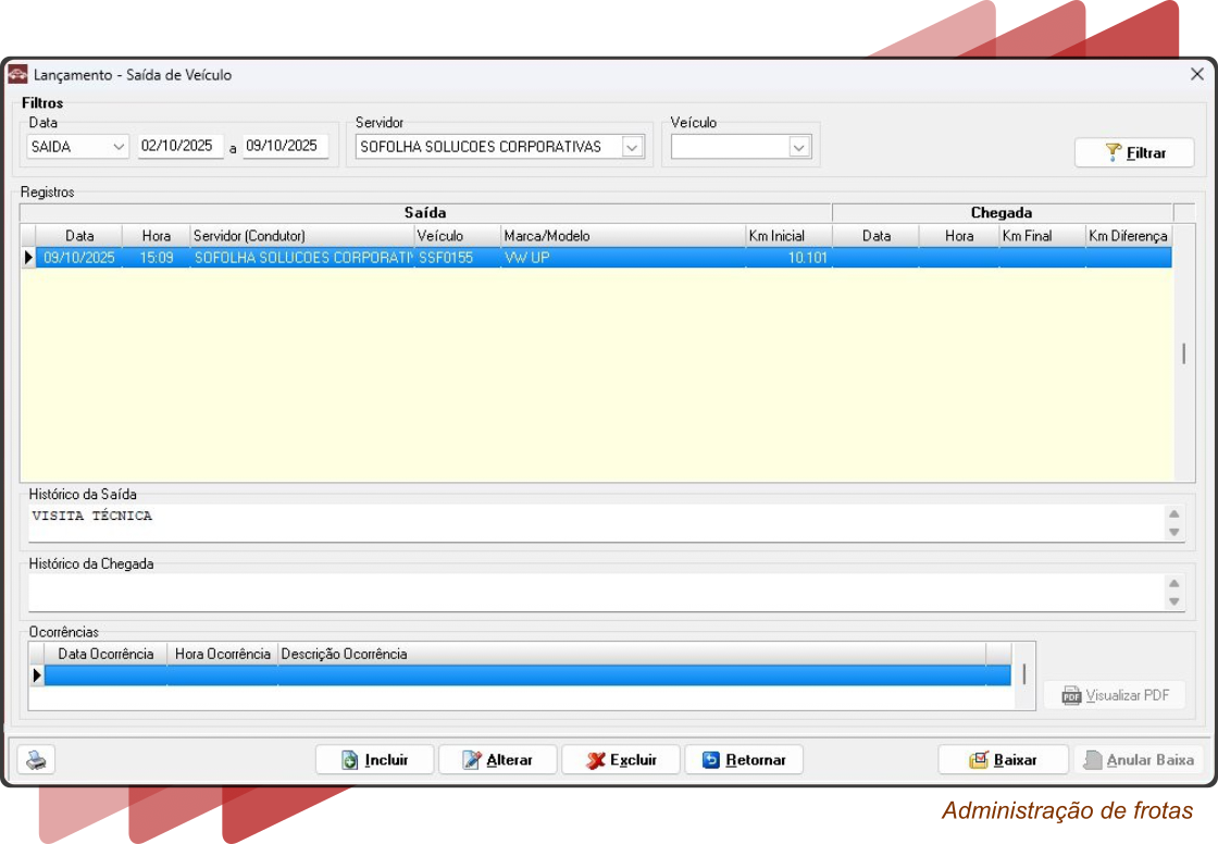 Permite o registro das ocorrências envolvendo os veículos, como multas, acidentes, registro de datas, servidores e valores envolvidos, e permite a anexação de documentos e imagens às ocorrências