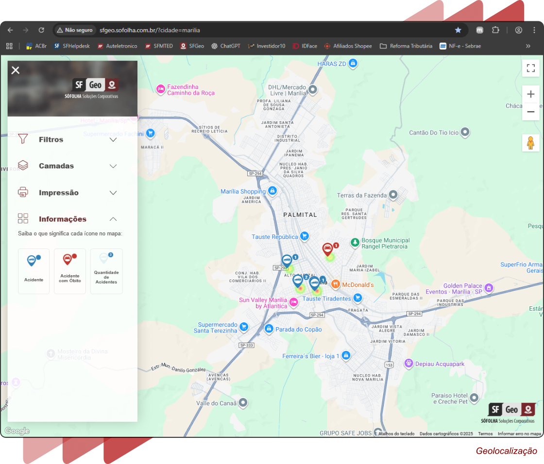 SFGeo é uma ferramenta que permite a visualização de um mapa de calor esquemático das ocorrências de acidentes de trânsito no município, classificadas conforme o nível de severidade. Dessa forma, torna-se possível identificar os pontos críticos da cidade e as causas das ocorrências
