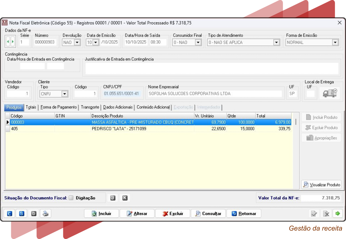 Emite NF-e (modelo 55), NF-e Complementar, NFS-e e Recibo Provisório de Serviço, com integração à emissão de orçamento de venda, pedido de venda e Webservices municipais