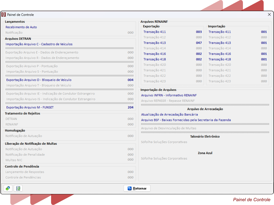 O sistema foi desenvolvido para gerenciar o processamento dos autos de infração de trânsito desde o recebimento, manual ou eletrônico (talonários, radares, avanço de semáforo, lombadas), até o pagamento da multa.