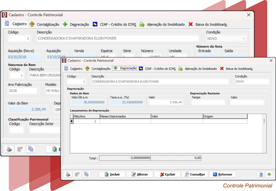 Permite registrar o processo licitatório, empenho e nota fiscal do item, controlar a depreciação, amortização e exaustão pelos métodos exigidos pela NBCASP, com armazenamento dos históricos e dados necessários para as notas explicativas dos demonstrativos contábeis