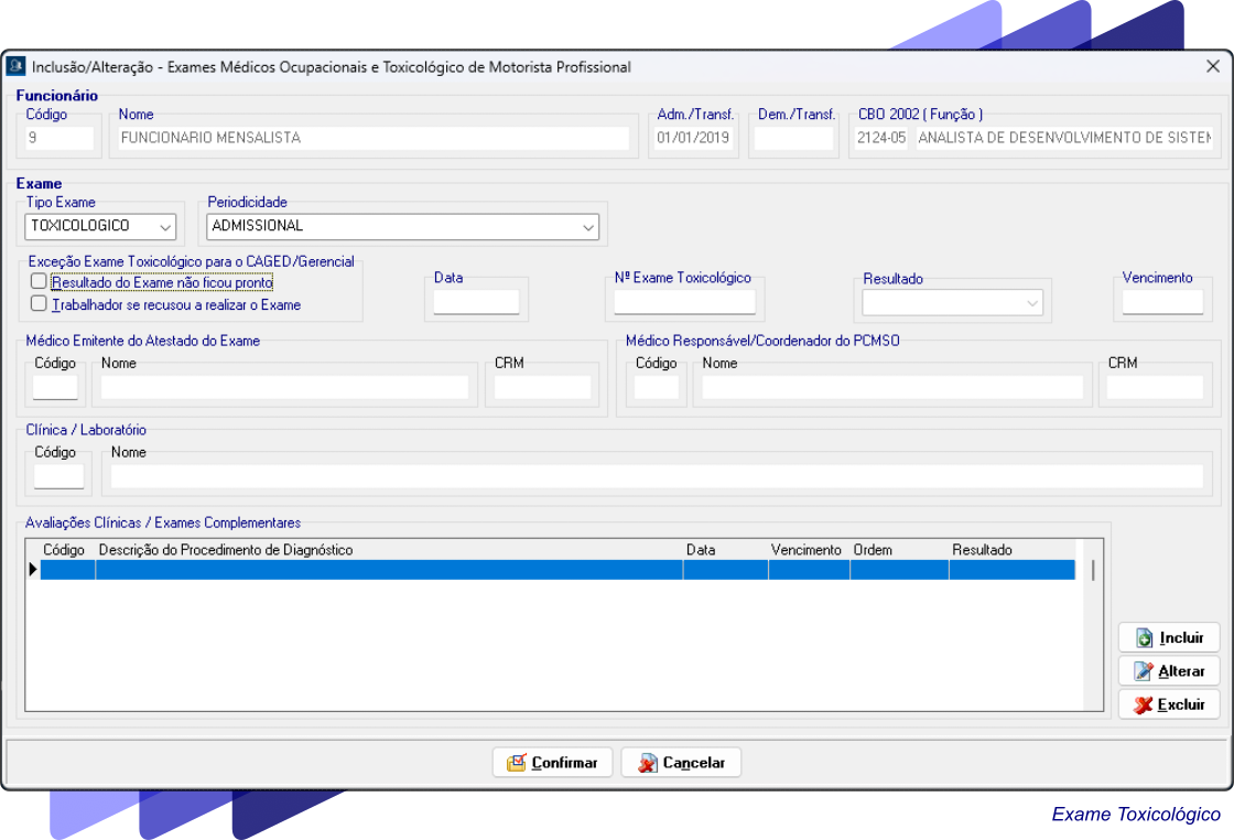 Módulo destinado ao gerenciamento completo das informações do Exame Toxicológico realizado pelo motorista profissional, com lançamento, controle e enfileiramento automático dos eventos para envio ao eSocial