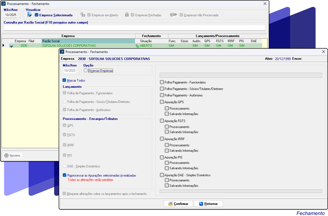 Fechamento e cálculo da folha de pagamento, com suporte a diversas empresas, tomadores de serviço e obras de construção civil