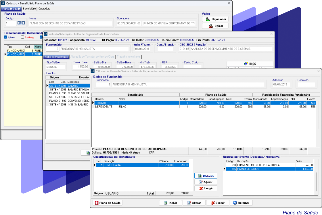 Controle automático de pagamento e desconto de plano de saúde, individualizando valores por titular e dependentes