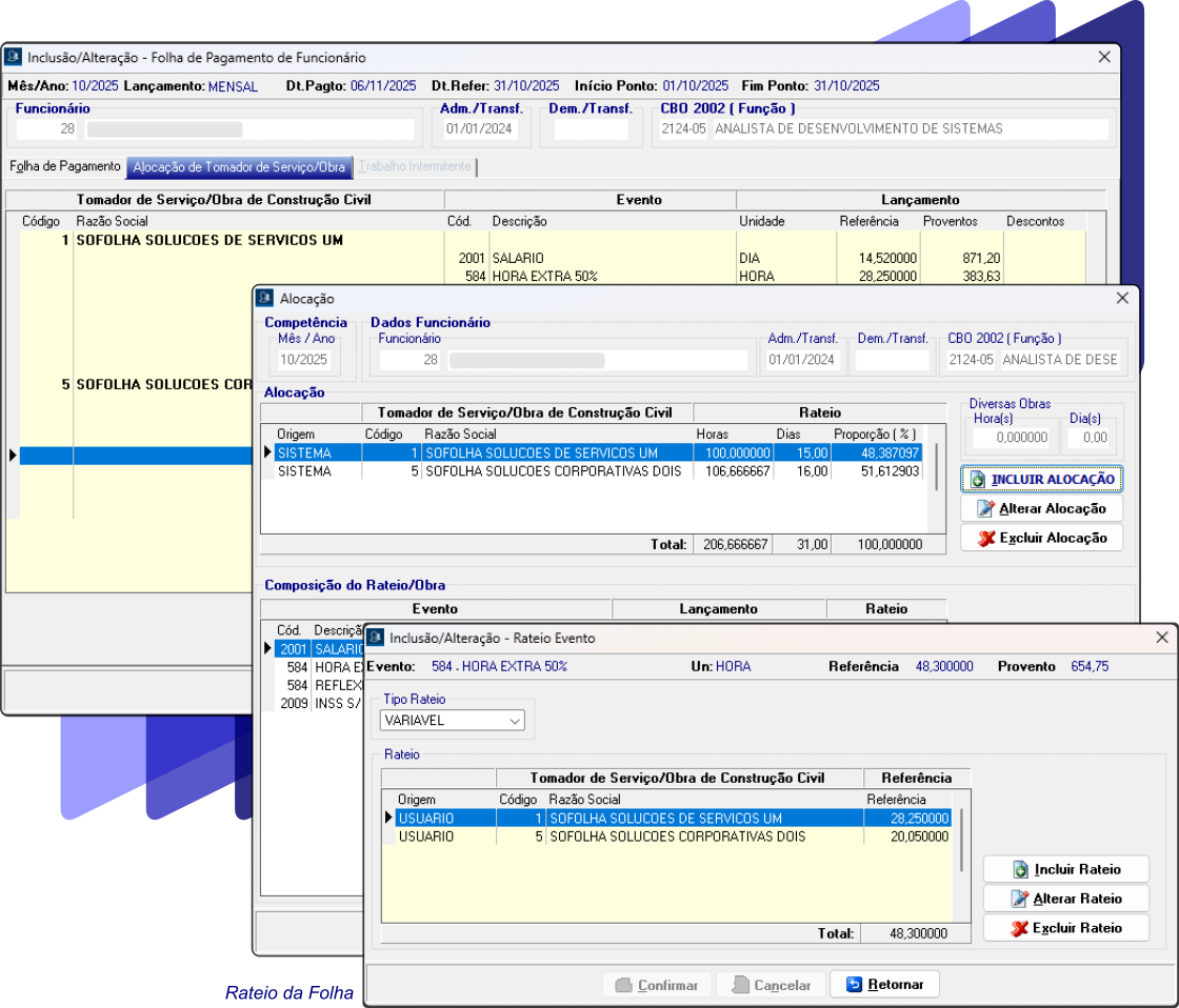Rateio inteligente dos proventos, descontos e encargos para empregados que atuam em múltiplos tomadores de serviço ou obras na mesma competência